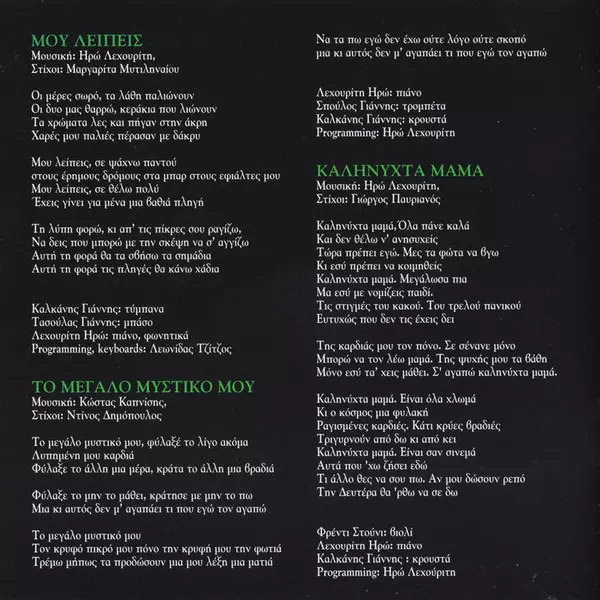Bass Γιάννης Τασσούλας | Drums Γιάννης Καλκάνης | Electric Guitar, Acoustic Guitar Γιάννης Εκμετζόγλου | Music By, Lyrics By Ηρώ Λεχουρίτη | Programmed By Λεωνίδας Τζίτζος