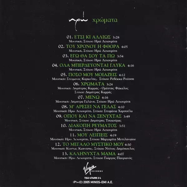 Ηρώ: Χρώματα verzia na CD v štandardný edícii. Toto konkrétne vydanie vyšlo v Řecku vo vydavateľstve Virgin dňa 10. januára 2008. Album zasahuje do žánrov Rock, Pop, Folk, World, & Country, Vokál, Balada, Soft Rock a Etno-pop.