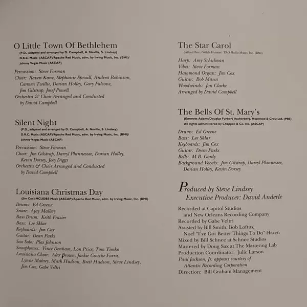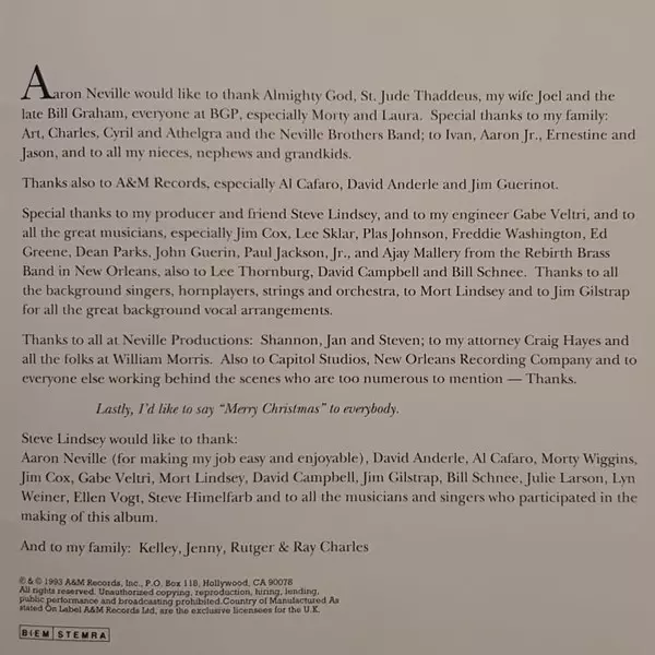 Adapted By, Arranged By Aaron Neville, David Campbell, Steve Lindsey (4) | Bass Freddie Washington | Choir Alex Brown, Darryl Phinnessee, Dorian Holley, Jackie Farris, Jim Gilstrap, Lynn Mabry | Drums Ed Greene (2) | Guitar Paul Jackson Jr. | Piano Jim Cox