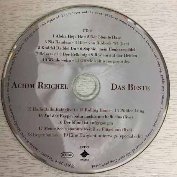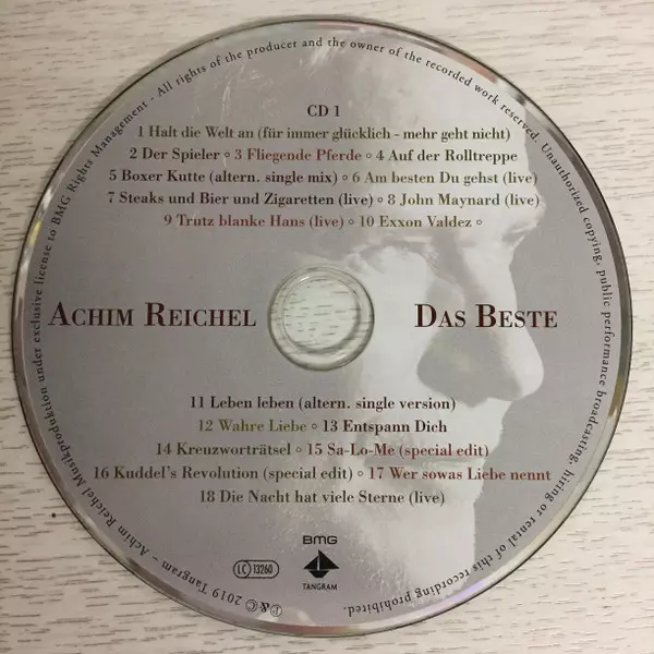 Achim Reichel: Das Beste verzia na 2CD v štandardný edícii. Toto konkrétne vydanie vyšlo v Německu vo vydavateľstve BMG v spolupráci s Tangram (2) dňa 25. januára 2019. Album zasahuje do žánrov Rock, Folk, World, & Country a Blues.