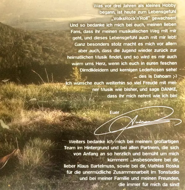 Choir Andreas Gabalier, Katharina Schicho, Uwe Schmidt (11) | Drums, Percussion Ryan Hoyle | Guitar Andreas Gabalier, Jörg Weisselberg, Mathias Roska, Peter Weihe | Harmonica Andreas Gabalier | Keyboards Achim Radloff, Alex Wende | Music By, Lyrics By Andreas Gabalier | Trumpet Andras Verpeleti