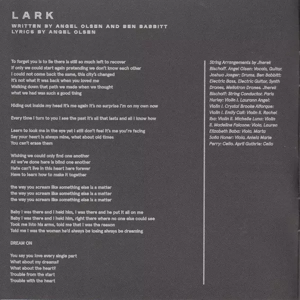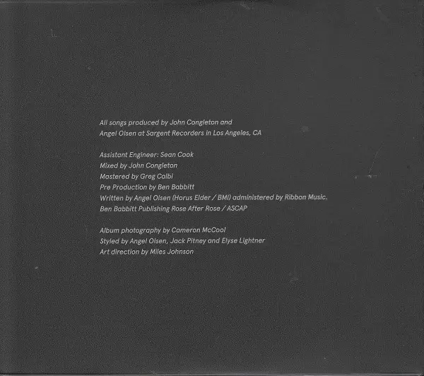 Arranged By [String Arrangement] Ben Babbitt | Baritone Guitar, Synth, Synth [Synth Bass], Vibraphone, Double Bass [Bowed Upright Bass], Bass [Fuzz Bass], Violin [Additional String Textures On Violin], Cello [Additional String Textures On Cello] Ben Babbitt | Cello Aniela Perry, April Guthrie | Conductor [String Conductor] Jherek Bischoff | Drums Joshua Jaeger | Lyrics By Angel Olsen | Viola Lauren Baba, Madeline Falcone, Marta Sofia Honer | Violin [Violin II] Emily Call, Michelle Luna (3), Rachel Iba | Violin [Violin I] Crystal Alforque, Laurann Angel, Paris Hurley | Vocals Angel Olsen | Written-By Angel Olsen, Ben Babbitt