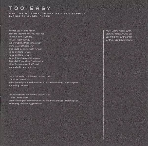 Bass, Synth, Synth [Bass Synth], E-Bow [E-Bow Electric Guitar] Ben Babbitt | Drums Joshua Jaeger | Lyrics By Angel Olsen | Vocals, Synth Angel Olsen | Written-By Angel Olsen, Ben Babbitt