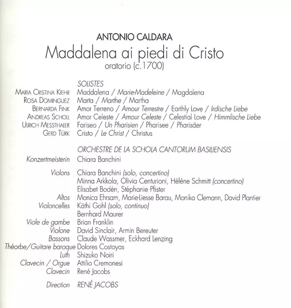 Bernarda Fink: Maddalena Ai Piedi Di Cristo verzia na 2CD v štandardný edícii. Toto konkrétne vydanie vyšlo v Evropě vo vydavateľstve Harmonia Mundi France v spolupráci s Harmonia Mundi dňa 23. augusta 1996. Album zasahuje do žánrov Klasická hudba, Baroková hudba a Oratorio.