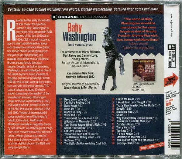 Baby Washington: That's How Heartaches Are Made - 1958-1962 Recordings verzia na CD v remasterované edícii. Toto konkrétne vydanie vyšlo v Evropě vo vydavateľstve Soul Jam Records dňa 2. decembra 2016. Album zasahuje do žánrov Funk / Soul a Soul.