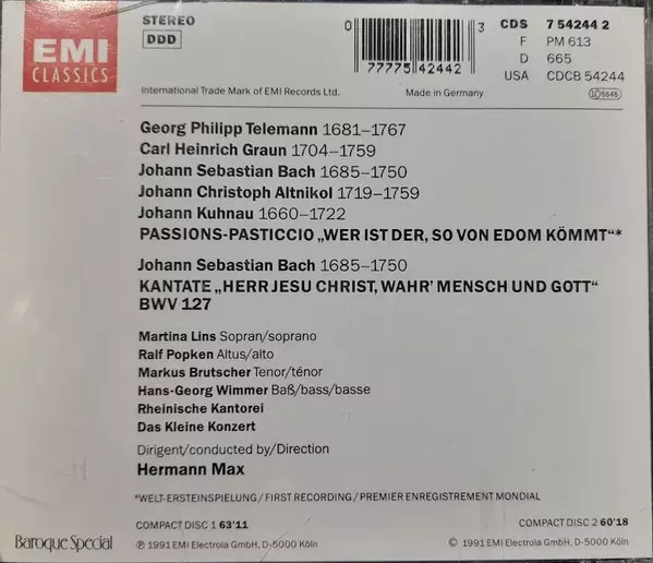 | Interpret | Johann Sebastian Bach | Georg Philipp Telemann | Carl Heinrich Graun | Rheinische Kantorei | Das Kleine Konzert | Hermann Max | Johann Christoph Altnickol |
