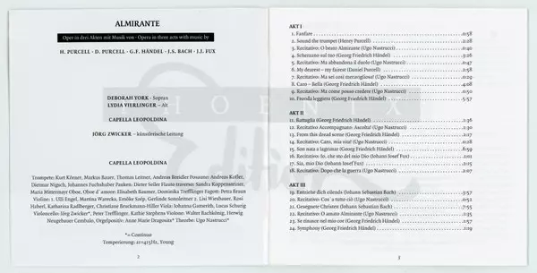 | Interpret | Johann Sebastian Bach | Georg Friedrich Händel | Henry Purcell | Johann Joseph Fux | Deborah York | Daniel Purcell | Lydia Seidl-Vierlinger | Capella Leopoldina | Jörg Zwicker |