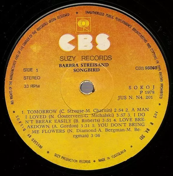 Barbra Streisand: Songbird verzia na vinylu LP v štandardný edícii. Toto konkrétne vydanie vyšlo v Yugoslávie vo vydavateľstve Suzy v spolupráci s CBS roka 1979. Album zasahuje do žánrov Pop a Balada.