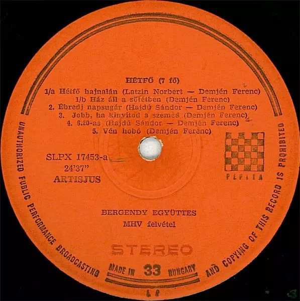 Bergendy: Hétfő verzia na vinylu 2LP v štandardný edícii. Toto konkrétne vydanie vyšlo v Maďarsko vo vydavateľstve Pepita roka 1973. Album zasahuje do žánrov Rock, Funk / Soul, Progresívny rock a Funk.