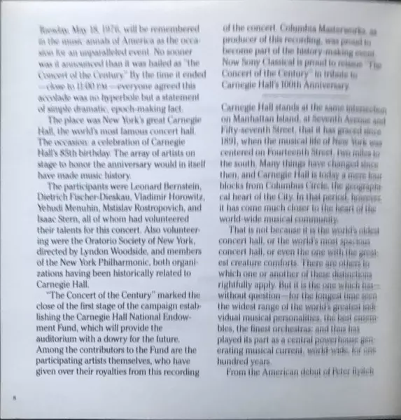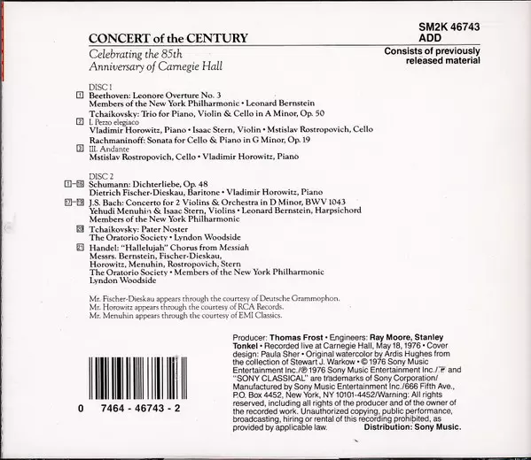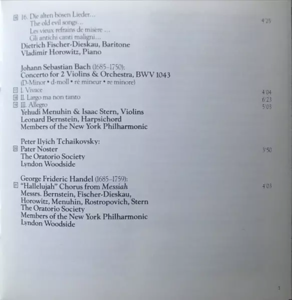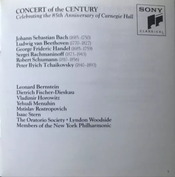 | Choir The Oratorio Society Of New York | Conductor Lyndon Woodside | Ensemble Dietrich Fischer-Dieskau, Isaac Stern, Leonard Bernstein, Mstislav Rostropovich, Vladimir Horowitz, Yehudi Menuhin | Orchestra Members Of The New York Philharmonic | |||