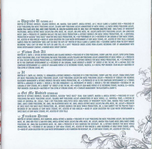 | Mixed By Jason Goldstein, Swizz Beatz | Mixed By [Assisted By] Steve Tolle | Producer Beyoncé Knowles, Sean Garrett, Swizz Beatz | Recorded By Jim Caruana | Recorded By [Assisted By] Rob Kinelski | Written-By Angela Renee Beyince, Beyoncé Knowles, Kaseem Dean, Makeba Riddick, Sean Garrett, Solange Knowles | |||
