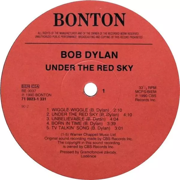 Bob Dylan: Under The Red Sky verzia na vinylu LP v štandardný edícii. Toto konkrétne vydanie vyšlo v Československu vo vydavateľstve Bonton roka 1990.