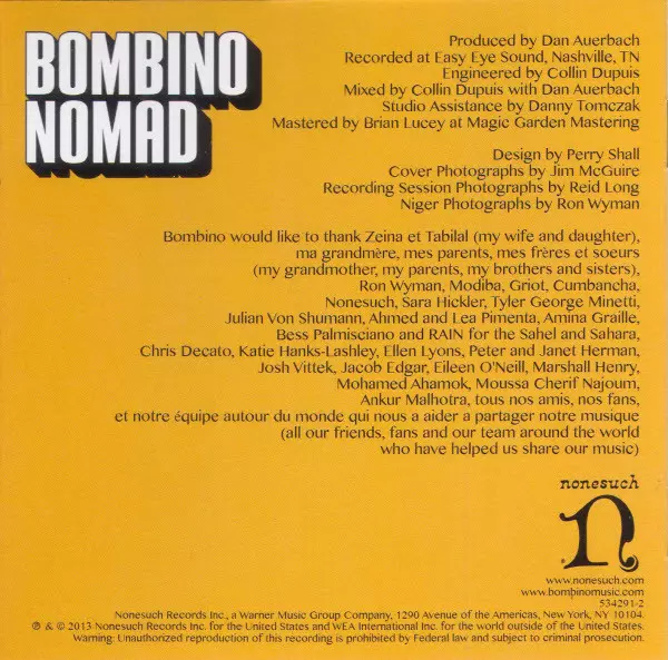 Bombino: Nomad verzia na CD v štandardný edícii. Toto konkrétne vydanie vyšlo v Európa vo vydavateľstve Nonesuch dňa 12. apríla 2013. Album zasahuje do žánrov Rock, Folk, World, & Country, Blues a African. Gatefold Cover.