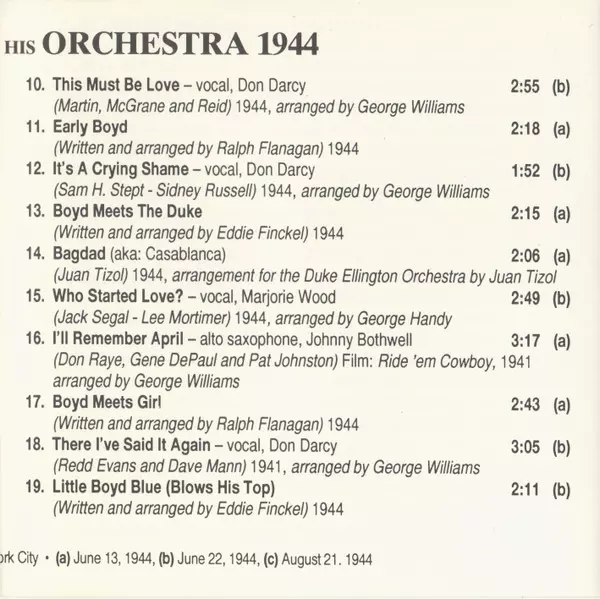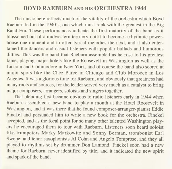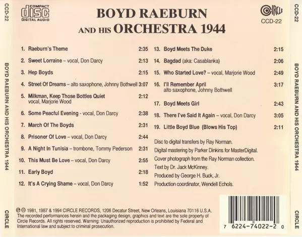 Boyd Raeburn And His Orchestra: 1944 verzia na CD v remasterované edícii. Toto konkrétne vydanie vyšlo v USA vo vydavateľstve Circle dňa 12. augusta 1994. Album zasahuje do žánrov Jazz, Big Band a Swing.