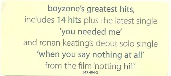 | 15 | Boyzone: You Needed Me | 3:29 min | |