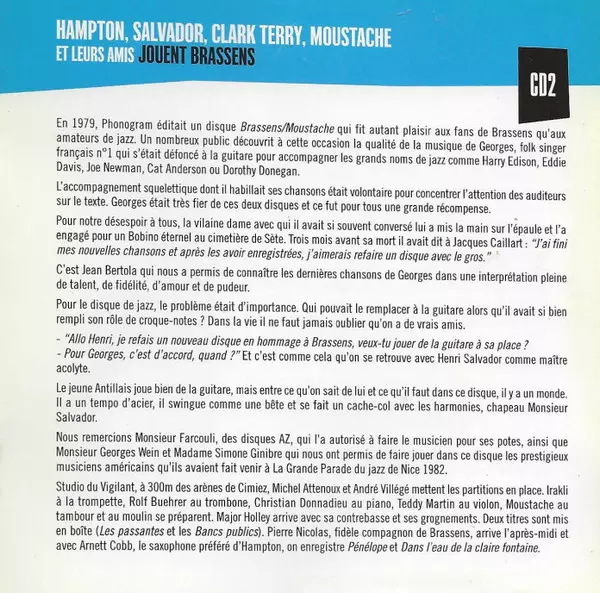 Clark Terry: Georges Brassens & Le Jazz verzia na 2CD v štandardný edícii. Toto konkrétne vydanie vyšlo v Francii vo vydavateľstve Universal Music v spolupráci s Mercury France a Universal Music Classics & Jazz France dňa 14. marca 2011. Album zasahuje do žánrov Pop a Jazz.