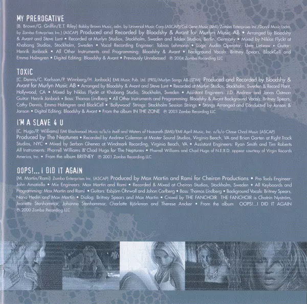 Arranged By Bloodshy & Avant, Stephen Broughton Lunt | Arranged By [Strings], Conductor [Strings] Janson & Janson | Backing Vocals BlackCell, Britney Spears, Cathy Dennis, Emma Holmgren | Bass Tomas Lindberg | Edited By [Digital Editing] Bloodshy & Avant | Engineer [Assistant] J.D. Andrew, Jonas Östman | Guitar Henrik Jonback | Instruments [All Other], Programmed By Bloodshy & Avant | Mixed By Niklas Flyckt | Producer, Recorded By Bloodshy & Avant | Strings ['bollywood' Strings] Stockholm Session Strings | Written-By Cathy Dennis, Christian Karlsson, Henrik Jonback, Pontus Winnberg