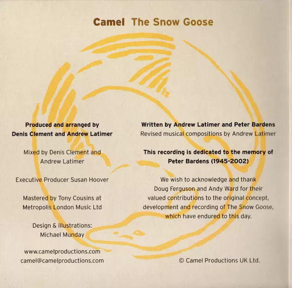 The Snow Goose is an album by British progressive rock band Camel , released in 1975. It is their sixth studio album and the first to feature guitarist Andrew Latimer and keyboardist Peter Bardens after the departure of original keyboardist Richard Sinclair. The album is named after the novel The Snow Goose, written by Paul Gallico.