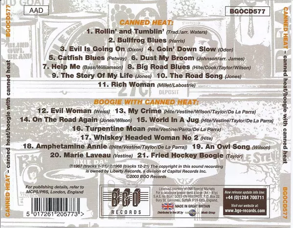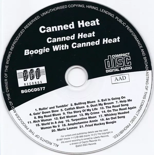 Původně vyšlo v letech 1967 a 1968 na značce Liberty. První album obsahuje přízemní, svižné country blues. Tu a tam sice ukradnou pár licků, ale výsledný produkt je jejich vlastní a kvílí. V písni "Boogie With Canned Heat" začíná rytmická sekce trochu povolovat, aby se rozjela; v jádru je to stále blues, ale směřuje k rocku. Na "Boogie" však nen...