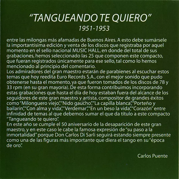 Carlos Di Sarli: Tangueando Te Quiero (1951-1953) verzia na CD v štandardný edícii. Toto konkrétne vydanie vyšlo v Argentina vo vydavateľstve Euro Records S.A. dňa 18. februára 2010. Album zasahuje do žánrov Pop, Latinská hudba, Tango a Light Music.