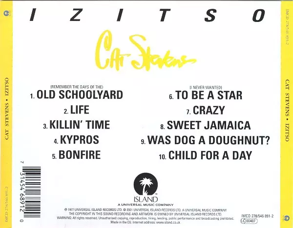 Cat Stevens: Izitso verzia na CD v remasterované edícii. Toto konkrétne vydanie vyšlo v Evropě vo vydavateľstve Island Remasters v spolupráci s Island Records dňa 27. októbra 2017. Album zasahuje do žánrov Rock a Elektronická hudba.