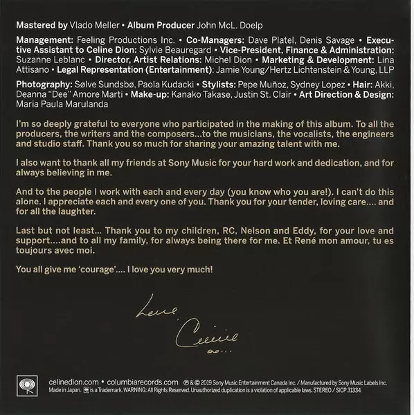 Céline Dion: Courage verzia na CD v štandardný edícii. Toto konkrétne vydanie vyšlo v Japonsku vo vydavateľstve Sony Records Int'l dňa 6. decembra 2019.