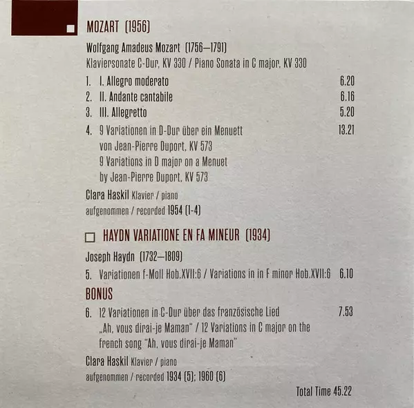 Clara Haskil: Milestones Of A Legend verzia na 10CD/Box Set v štandardný edícii. Toto konkrétne vydanie vyšlo v Evropě, USA a Kanadě vo vydavateľstve Documents v spolupráci s The Intense Media dňa 19. augusta 2016. Album zasahuje do žánrov Klasická hudba, Baroková hudba, Romantika a Impressionistic.