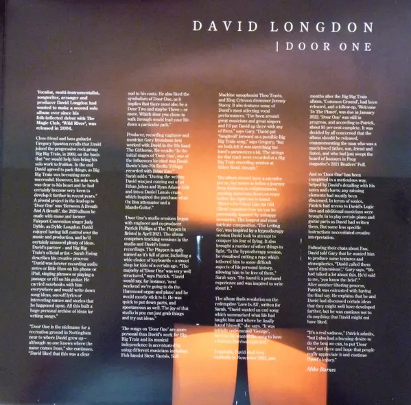 David Longdon: Door One CLR | LTD verzia na vinylu LP v kolorované limitované edícii. Toto konkrétne vydanie vyšlo v Velké Británii vo vydavateľstve Plane Groovy dňa 12. apríla 2023. Album zasahuje do žánrov Rock a Akustická hudba. High Quality White Coloured Vinyl.