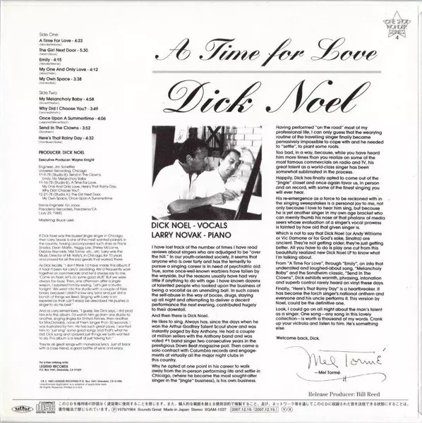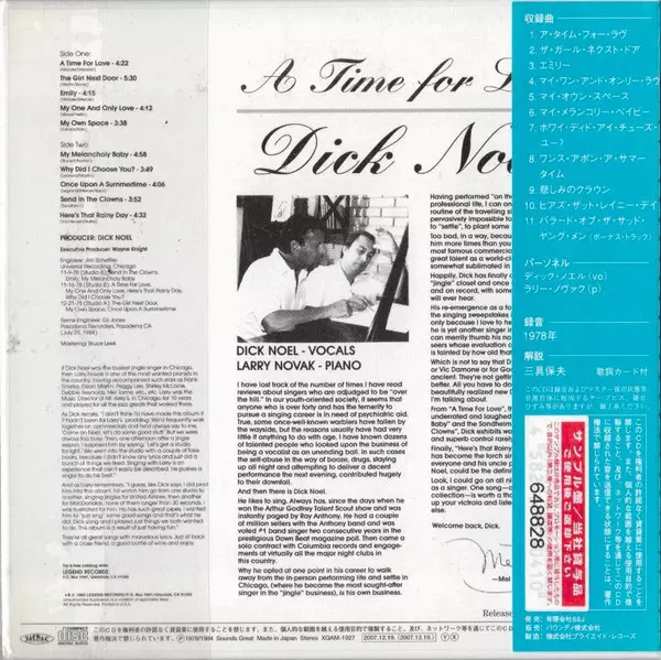 Dick Noel: A Time For Love +1 verzia na CD v štandardný edícii. Toto konkrétne vydanie vyšlo v Japonsku vo vydavateľstve SSJ dňa 7. novembra 2012. Album možno zaradiť do žánru Jazz.