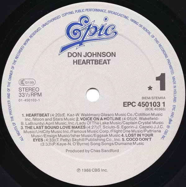 Don Johnson: Heartbeat verzia na vinylu LP v štandardný edícii. Toto konkrétne vydanie vyšlo v Evropě vo vydavateľstve Epic roka 1986. Album zasahuje do žánrov Rock, Pop a Pop Rock. Gatefold Vinyl.