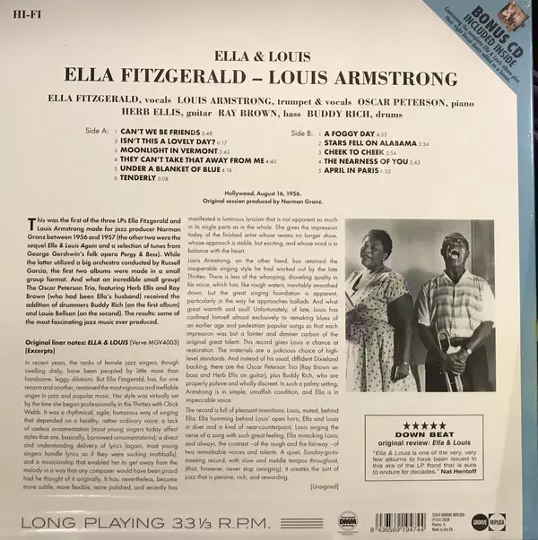 Nadčasový jazz od dvou největších osobností jazzové branže. "Ella and Louis" je studiové album Elly Fitzgeraldové a Louise Armstronga z roku 1956, na kterém je doprovází Oscar Peterson Quartet. Poté, co spolu Fitzgeraldová a Armstrong spolupracovali již koncem 40. let pro label Decca, bylo toto první ze tří alb, která Fitzgeraldová a Armstrong s...
