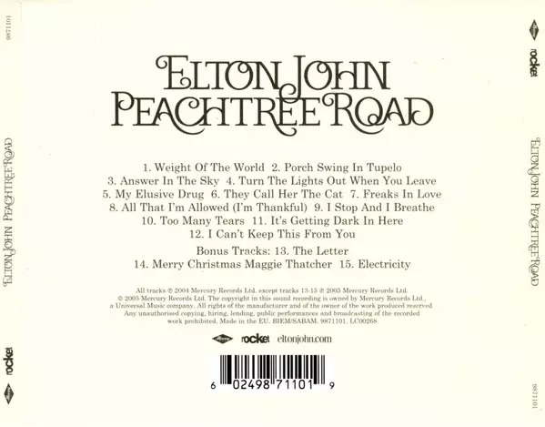 Elton John: Peachtree Road verzia na CD v štandardný edícii. Toto konkrétne vydanie vyšlo v Evropě vo vydavateľstve The Rocket Record Company v spolupráci s Mercury dňa 9. novembra 2017.