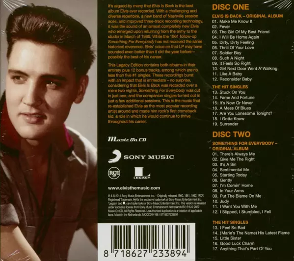 Dvě z nejlepších Elvisových alb + 12 hitových singlů jako bonusové skladby! Toto album, nahrané krátce po Elvisově propuštění z americké armády v roce 1960, je zcela odlišné od toho, co dělal předtím nebo co dělal později. "Elvis Is Back" bylo prvním Presleyho albem, které vyšlo ve stereofonním zvuku. A vrátil se ve velkém stylu! Jedná se možn...