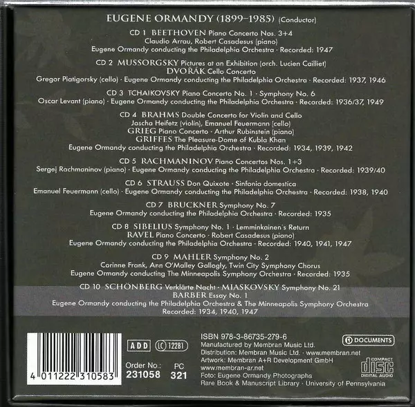 Various: 10 CD-Set Eugene Ormandy (1899-1985) verzia na 10CD v štandardný edícii. Toto konkrétne vydanie vyšlo v Velké Británii vo vydavateľstve Documents dňa 17. augusta 2011. Album zasahuje do žánrov Klasická hudba, Modernizmus a Romantika.