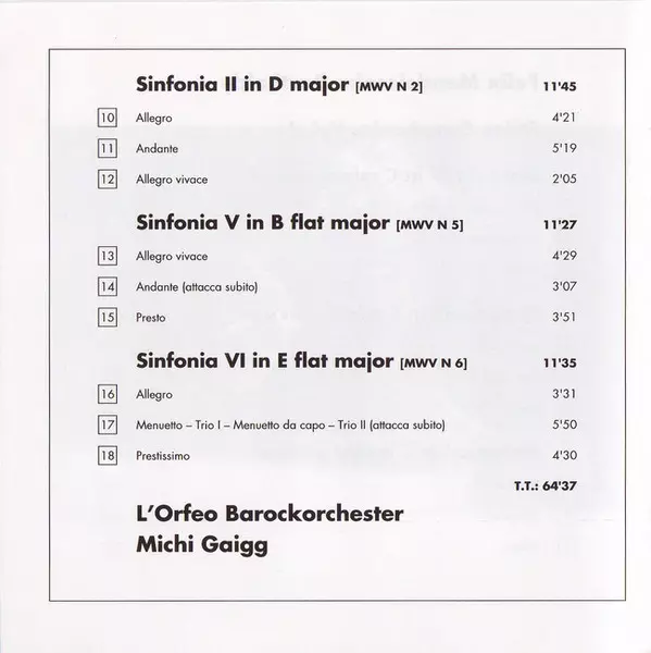 | Sinfonia VI In E Flat Major (MWV N 6) | 11:35 min |