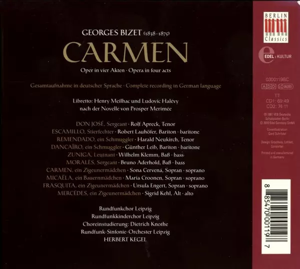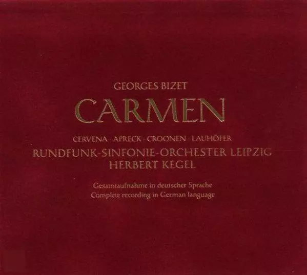 Georges Bizet: Carmen (Complete Recording In German Language) DIGI verzia na 2CD v digipack remasterované edícii. Toto konkrétne vydanie vyšlo v Evropě vo vydavateľstve Berlin Classics v spolupráci s Edel:Kultur dňa 25. februára 2011. Album zasahuje do žánrov Klasická hudba a Opera. Digipack In Dt.spr. Vinyl.