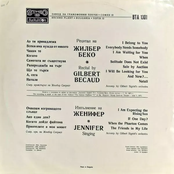| Interpret | Gilbert Bécaud | Jennifer |