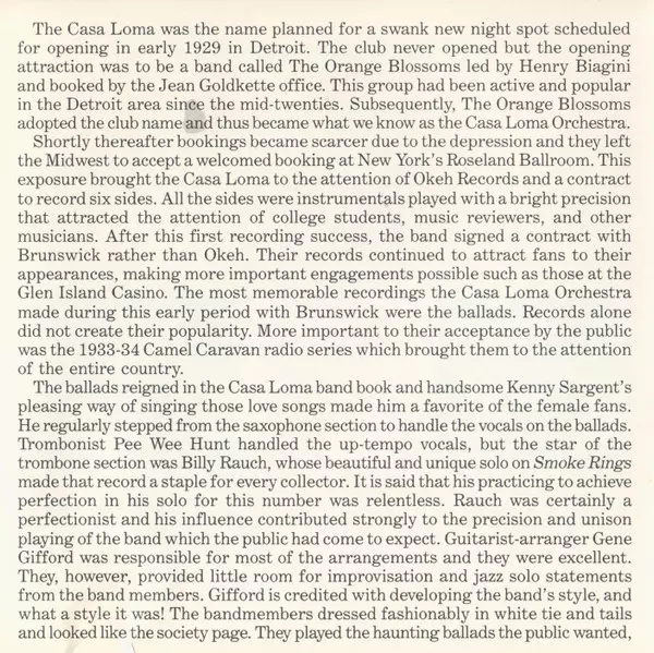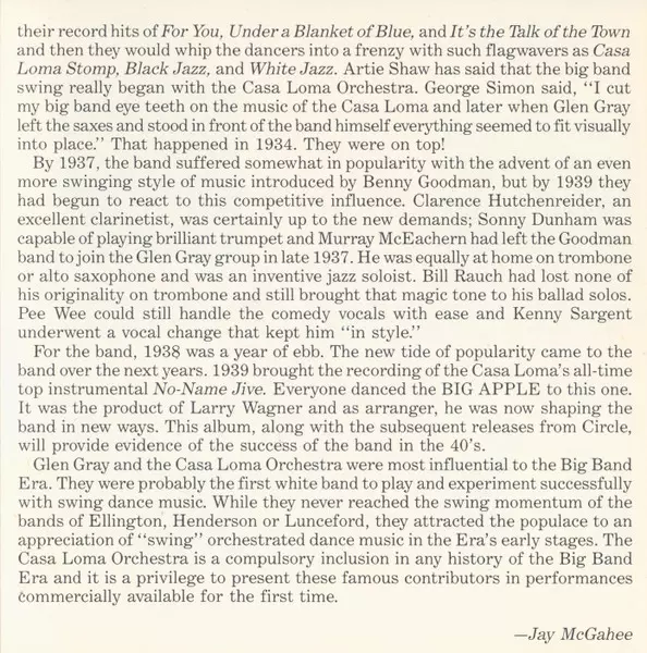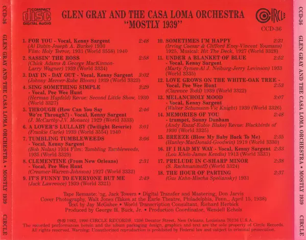 Glen Gray & The Casa Loma Orchestra: Mostly 1939 verzia na CD v remasterované edícii. Toto konkrétne vydanie vyšlo v USA vo vydavateľstve Circle dňa 11. augusta 1994. Album zasahuje do žánrov Jazz a Big Band.