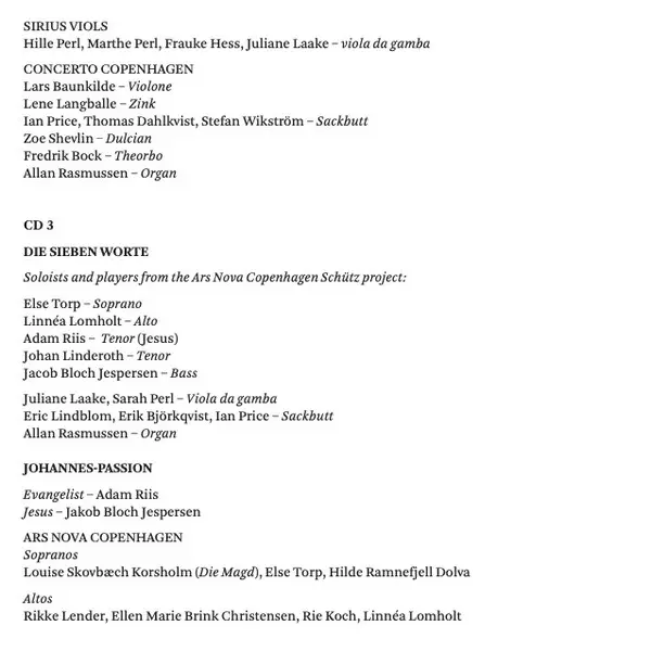| Ensemble Sirius Viols | Orchestra Concerto Copenhagen | Vocals Johan Linderoth | ||
