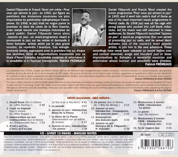 Henri Salvador: Mes Inédits : Janvier-Juin 1958 verzia na CD v štandardný edícii. Toto konkrétne vydanie vyšlo v Francii vo vydavateľstve Frémeaux & Associés dňa 21. júla 2017. Album zasahuje do žánrov Pop, Jazz a Chanson.