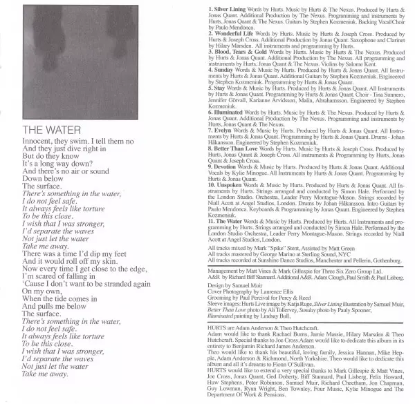 Pustí mi nějakou hudbu na střední hlasitost. Tyhle chvíle bývají dost děsivé; sedět vedle hudebníků v křeslech a poslouchat jejich produkci. Ale tady to tak není. Atmosféra je klidná a jaksi léčivá. Když začíná první skladba, uvědomuji si, že nemám žádné předsudky, žádná konkrétní očekávání. To se stává málokdy a je to příjemné. To, co slyším, zní tak trochu jako sebevědomé, epické baladické řemeslo, které si spojuji s americkým R&B. Hudba je expanzivní, sebevědomá a plná štěstí. Je cítit, že Hurts mají k současné hudbě otevřený, zaujatý a nekomplikovaný vztah. Ke skládání písní přistupují nezaujatě a bez omezení. Je to osvěžující, bezstarostné. Nesnaží se být cool ani trapně kombinovat žánry. Výpověď Hurts je emotivní.
