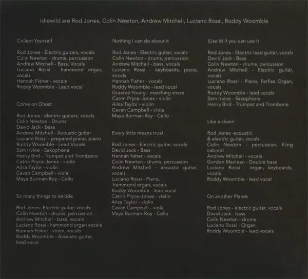 Double Bass Gordon Maclean | Electric Guitar, Trumpet, Vocals Rod Jones (2) | Lead Vocals Roddy Woomble | Piano, Harmonium, Vocals Luciano Rossi (2) | Vocals Andrew Mitchell (7)