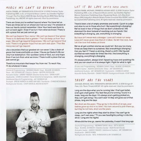 Acoustic Guitar Danny Rader | Backing Vocals Chip Davis (2), Jason Crabb | Bass Seth Bolte | Drums, Drum Programming Neiman Davis | Electric Guitar Austin Goodloe | Guitar [Additional] Jay Demarcus | Keyboards Blaine Johnson (3), Charles Judge | Tenor Saxophone, Baritone Saxophone Mark Douthit | Trombone, Arranged By [Horns] Chris McDonald | Trumpet Mike Haynes, Steve Patrick (2) | Written-By Jason Crabb, Michael Farren, Tony Wood (2)