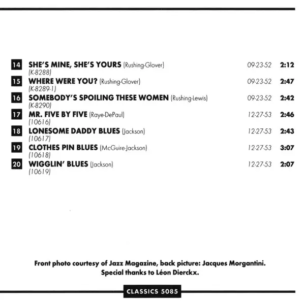 | 19 | Jimmy Rushing, Frank Culley & His Band: Clothes Pin Blues | 3:07 min | |