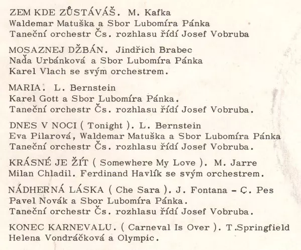 | Chorus Master Lubomír Pánek | Chorus [Sbor] Lubomír Pánek Singers | Conductor [Řídí] Josef Vobruba | Music By Carlo Pes, Jimmy Fontana | Orchestra Czechoslovak Radio Dance Orchestra | Vocals Pavel Novák | |||