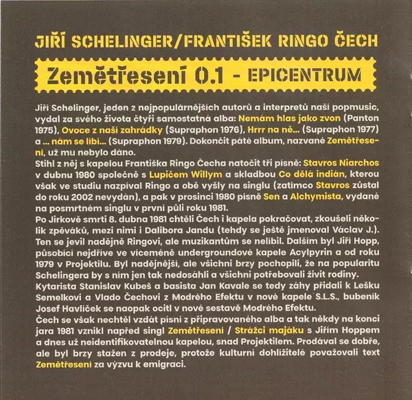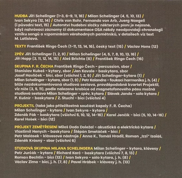 | Backing Band Skupina F. R. Čecha | Bass Guitar, Backing Vocals Jan Kavale | Drums, Backing Vocals Josef Havlíček | Guitar, Backing Vocals Stanislav Kubeš | Lyrics By František Ringo Čech | Music By Jiří Schelinger | Percussion, Backing Vocals František Ringo Čech | |||