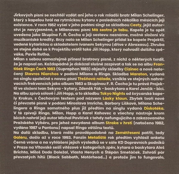 | Backing Band Skupina F. R. Čecha | Bass Guitar, Backing Vocals Jan Kavale | Drums, Backing Vocals Josef Havlíček | Guitar Jiří Schelinger | Guitar, Backing Vocals Milan Schelinger, Stanislav Kubeš | Lyrics By František Ringo Čech | Music By Milan Schelinger | Percussion, Backing Vocals František Ringo Čech | |||