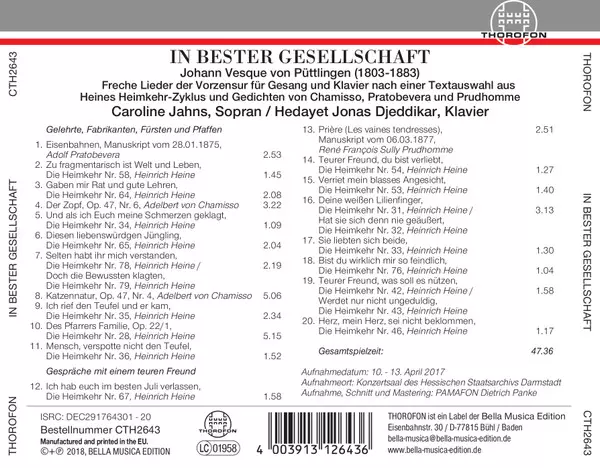 Johann Vesque von Püttlingen: In Bester Gesellschaft verzia na CD v štandardný edícii. Toto konkrétne vydanie vyšlo v Německu vo vydavateľstve Thorofon dňa 2. marca 2018. Album zasahuje do žánrov Klasická hudba a Romantika.