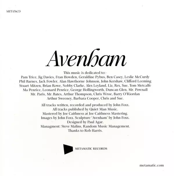 John Foxx: Avenham LTD verzia na CD v limitované edícii. Toto konkrétne vydanie vyšlo v Veľká Británia vo vydavateľstve Metamatic dňa 14. apríla 2023. Album zasahuje do žánrov Elektronická hudba a Ambient.