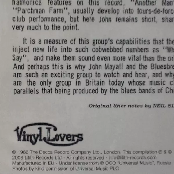 John Mayall: Blues Breakers With Eric Clapton verzia na vinylu LP v štandardný edícii. Toto konkrétne vydanie vyšlo v Rusko vo vydavateľstve Vinyl Lovers dňa 5. februára 2008.